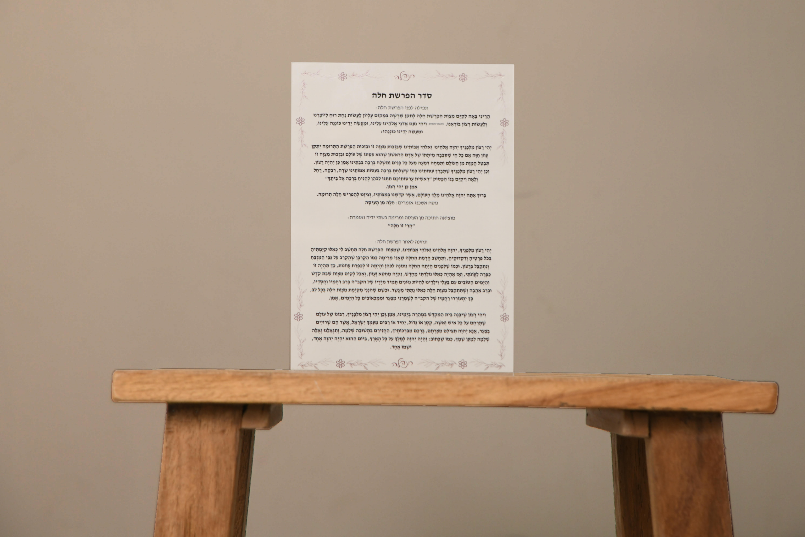 לצד הקערה והכיסוי הוספתי לכן קלף עם סדר הפרשת חלה, כדי שתוכלו לגשת למצווה הזאת בקלות, ברוגע ובהתרגשות. הקלף עשוי אקריל איכותי, מתוך מחשבה שגם אם הידיים נגעו בבצק ובשמן, הוא לא יוכתם, ניתן יהיה לנקות אותו בקלות, והוא יהיה עמיד לשימוש חוזר ולאורך זמן. ומה שיותר חשוב- סדר הפרשת החלה כתוב בו בנוסח מלא, כדי שתרוויחו את כל הברכות בשעת הרצון הגדולה הזאת.