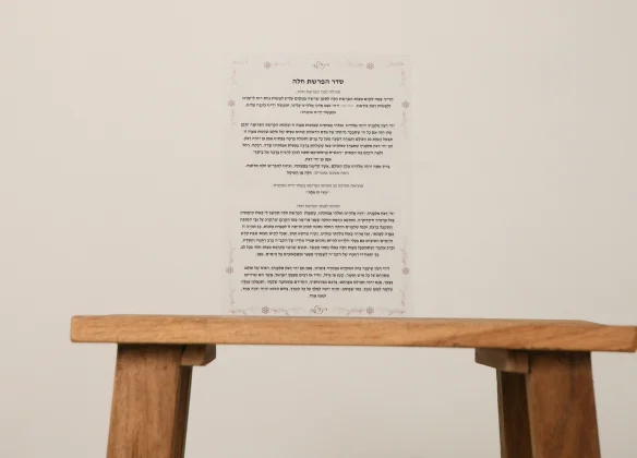 קלף אקריל איכותי ועליו סדר הפרשת חלה, בעיצוב נקי וברור לקריאה. הקלף עמיד לשימוש חוזר ולאורך זמן, ומאפשר לקיים את המצווה בנחת ובכוונה גדולה.